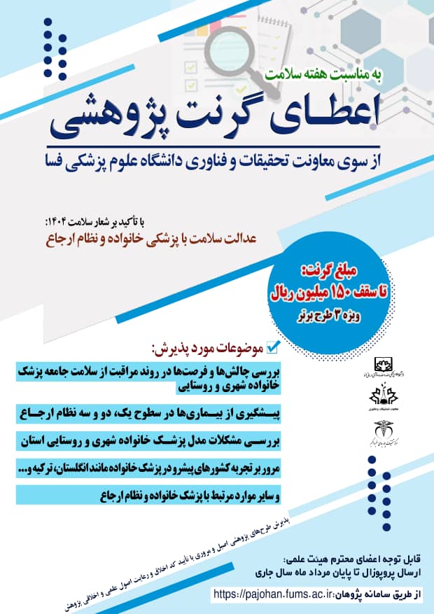 به گزارش روابط عمومی معاونت تحقیقات و فناوری: دکتر فرجام در نظر دارد با توجه به اهمیت موضوع و تاکیدات وزارت بهداشت درمان و آموزش پزشکی و ریاست دانشگاه بمناسبت هفته سلامت به محققین گرنت پژوهشی اعطا نماید. حداکثر مبلغ این گرنت پژوهشی 150 میلیون ریال و به سه پروپوزال برتر تعلق خواهد گرفت.