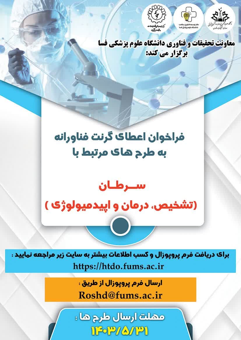 دکتر فرجاد فر اعلام نمود: به جهت اجرای رسالت خود در راستای توسعه و ارتقا فناوری و همچنین بهره گیری از ظرفیت اعضای هیأت علمی، دانشجویان، فناوران و نوآوران سراسر کشور، در نظر دارد فراخوان اعطای گرنت به طرح های فناورانه و محصول محور در حوزه   سرطان (تشخیص،درمان و اپیدمیولوژی)  را تا تاریخ 31 / 05 / 1403 برگزار نماید.